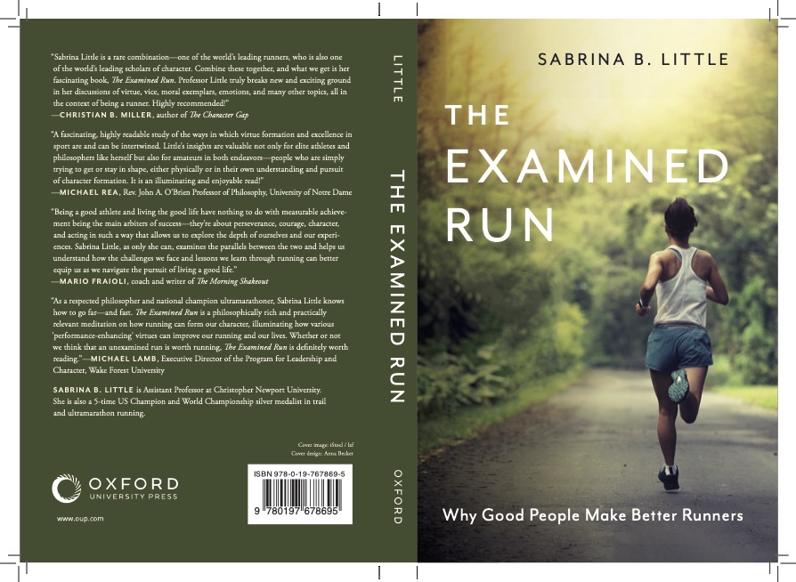My first book was released with Oxford University Press in March 2024. It is entitled The Examined Run. I argue that virtue ethics provides a vocabulary for athletes to better understand their own formation in sport, and assists them in developing a vision of what a rich athletic life can look like. I write about suffering, happiness, emotions, what it means to compete well, and how to learn from excellent people.